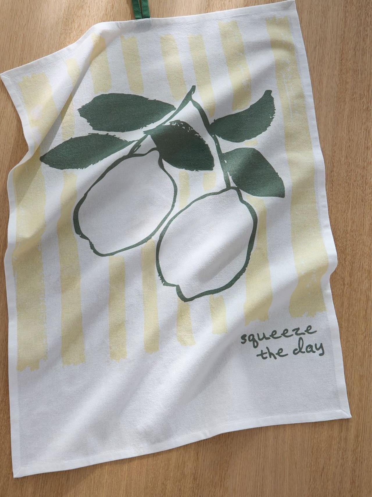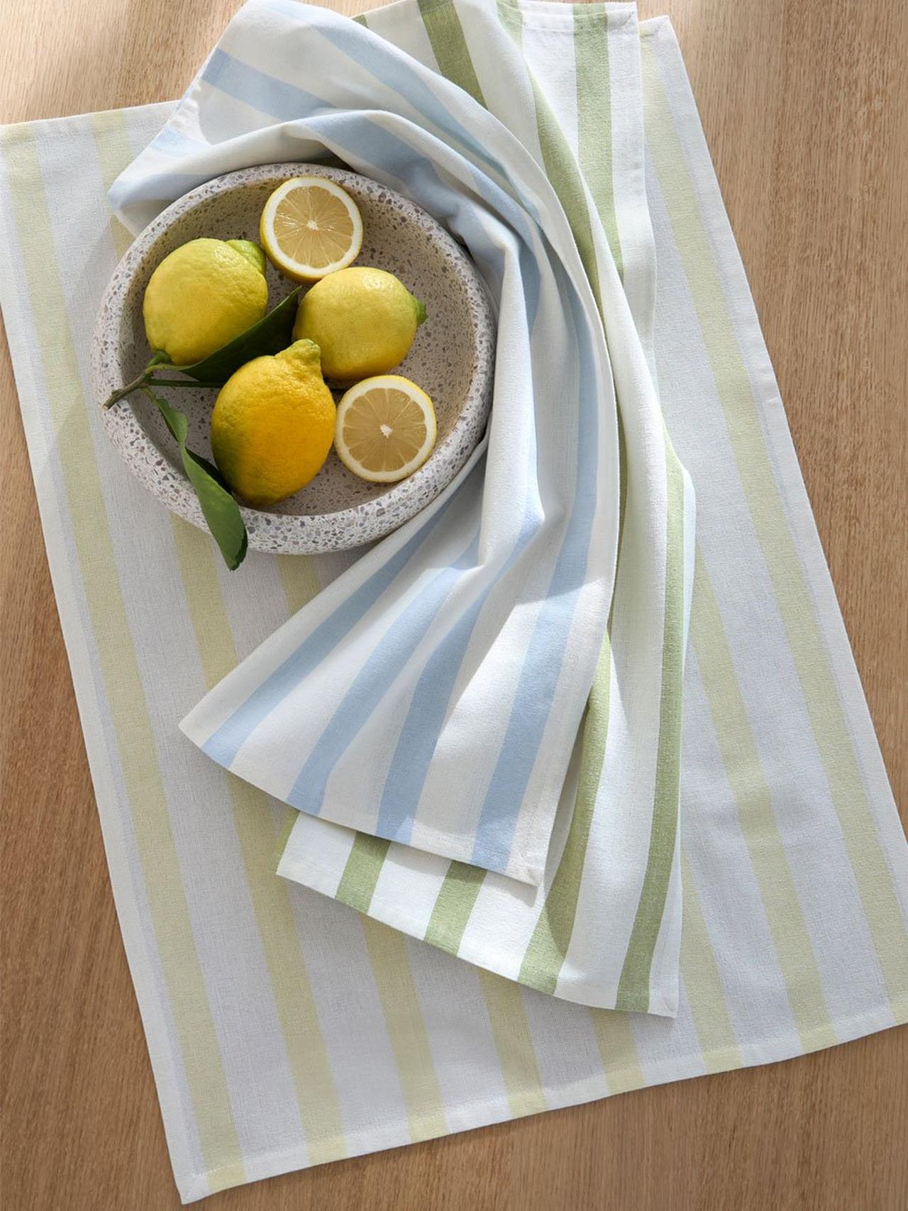 Diese Geschirrtücher bringen Spaß in die Küche. Zarte Streifen und fruchtige Prints setzen besondere Akzente.