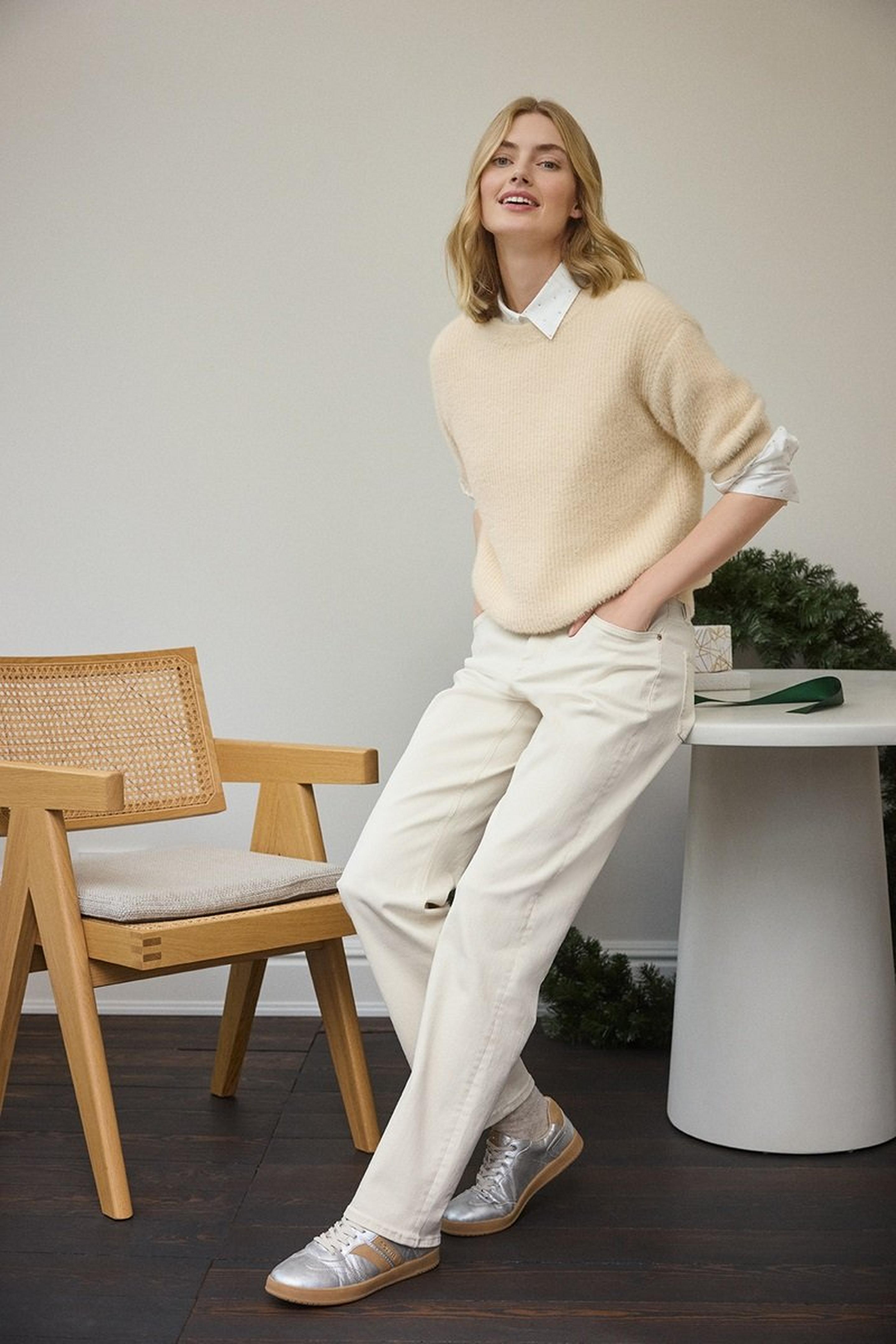 Glatte Stoffe treffen auf feinen Strick, Denim auf soften Jersey. Das verleiht reduzierten Looks Tiefe – ganz ohne Aufwand.