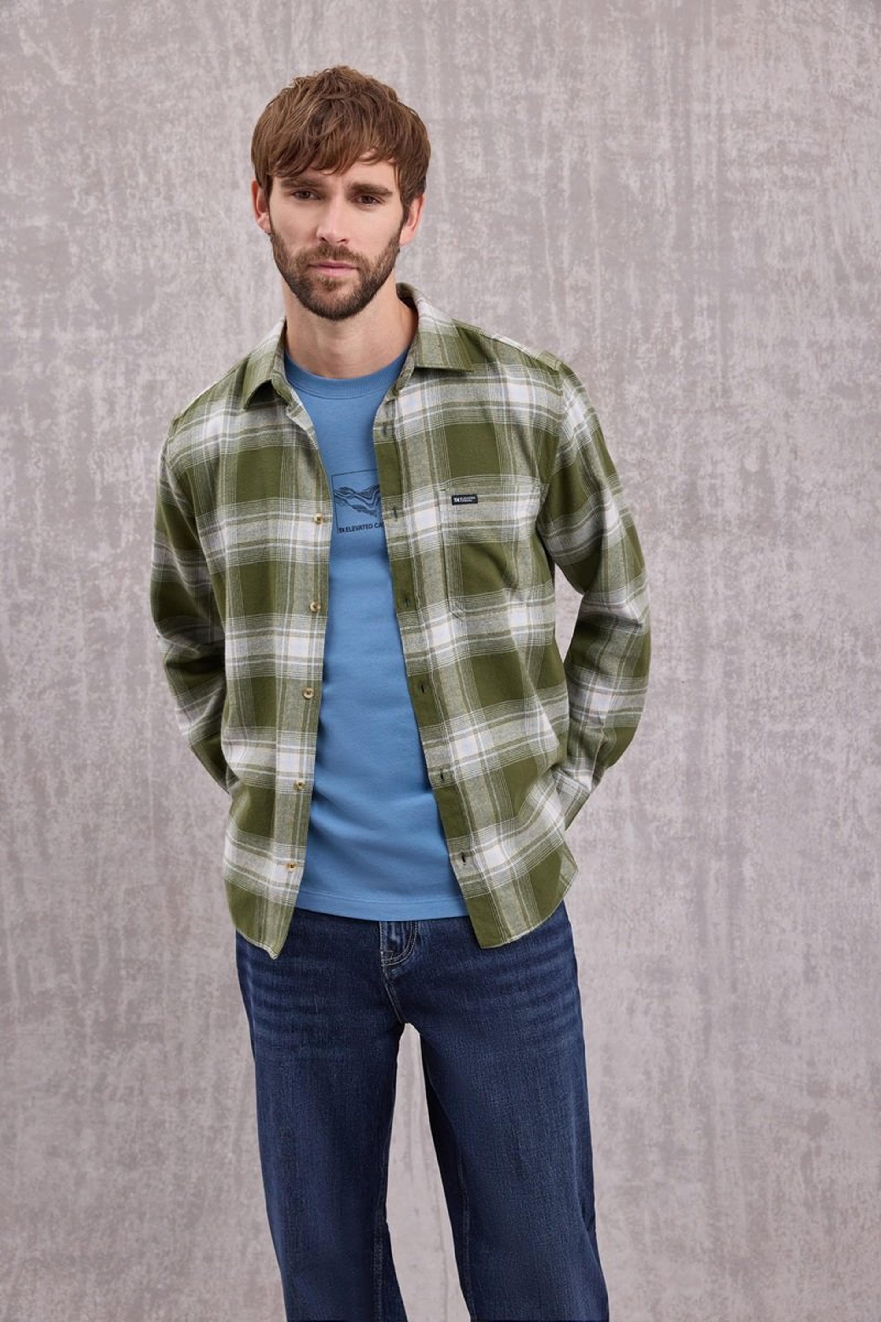 In Übergangszeiten kannst du ein dickes, gefüttertes Flanellhemd wie ein Overshirt tragen – offen über Hoodie oder Rollkragenpullover. Besonders angesagt: Modelle mit Brusttaschen und breitem Karo in Naturtönen wie Beige, Oliv oder Dunkelblau.