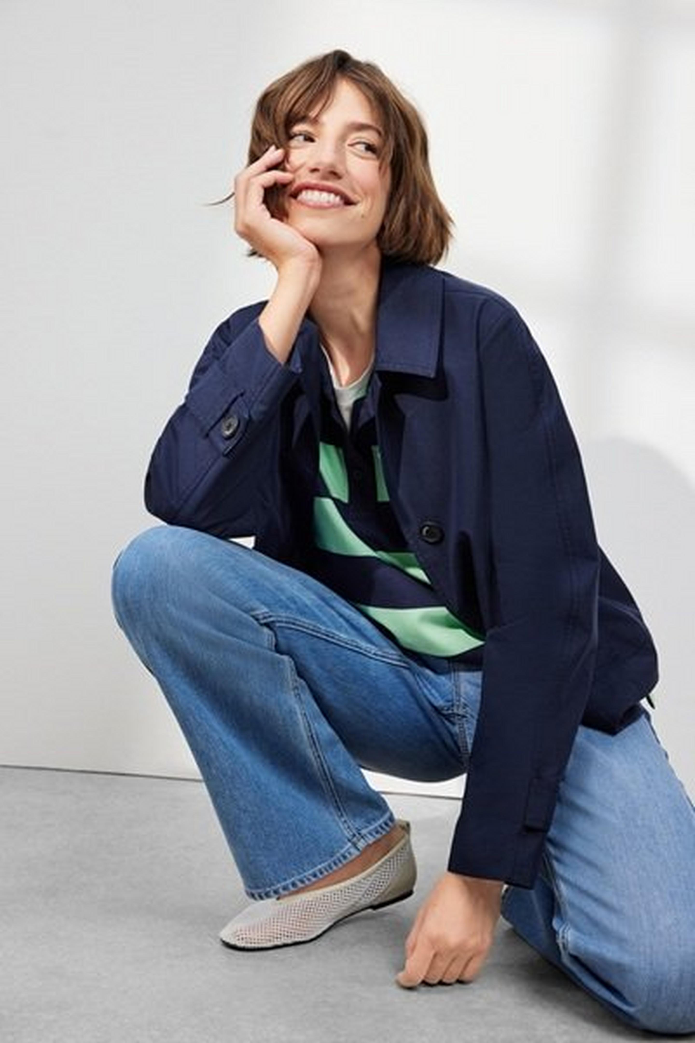 Ein kurzer Trenchcoat lässt sich gut mit High-Waist-Hosen, Jeans oder Kleidern kombinieren. Er passt zu lässigen wie auch eleganteren Outfits.