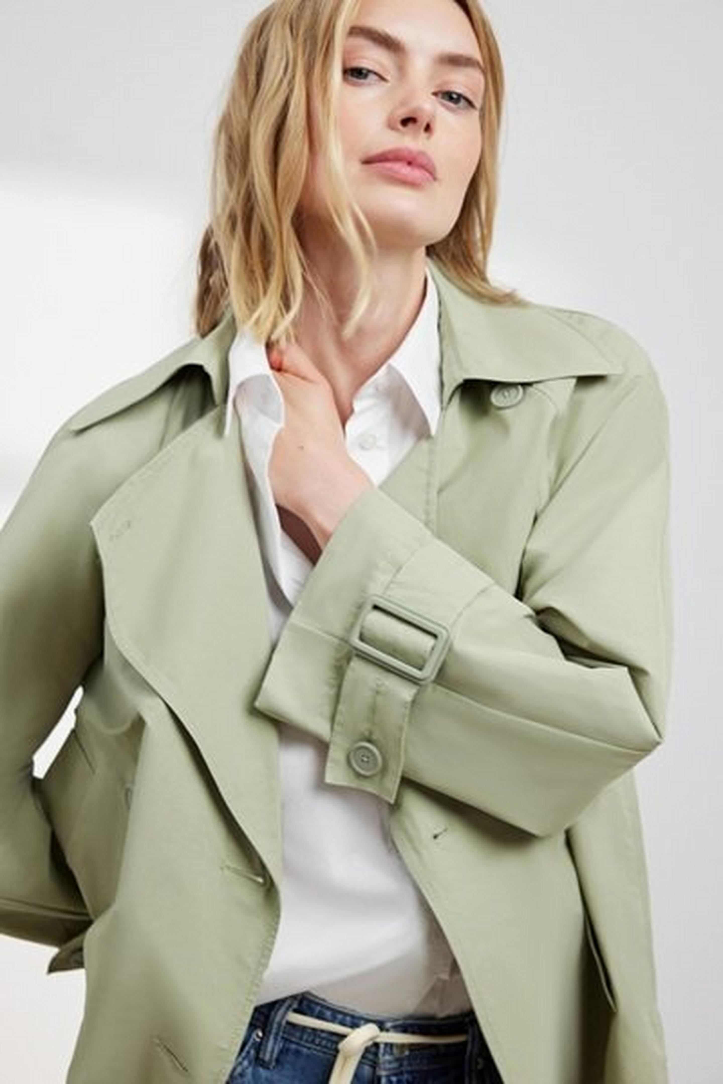 Typische Farben sind natürliche Nuancen wie Beige, Sand oder Lindgrün – perfekt, um den Trenchcoat vielseitig zu stylen.